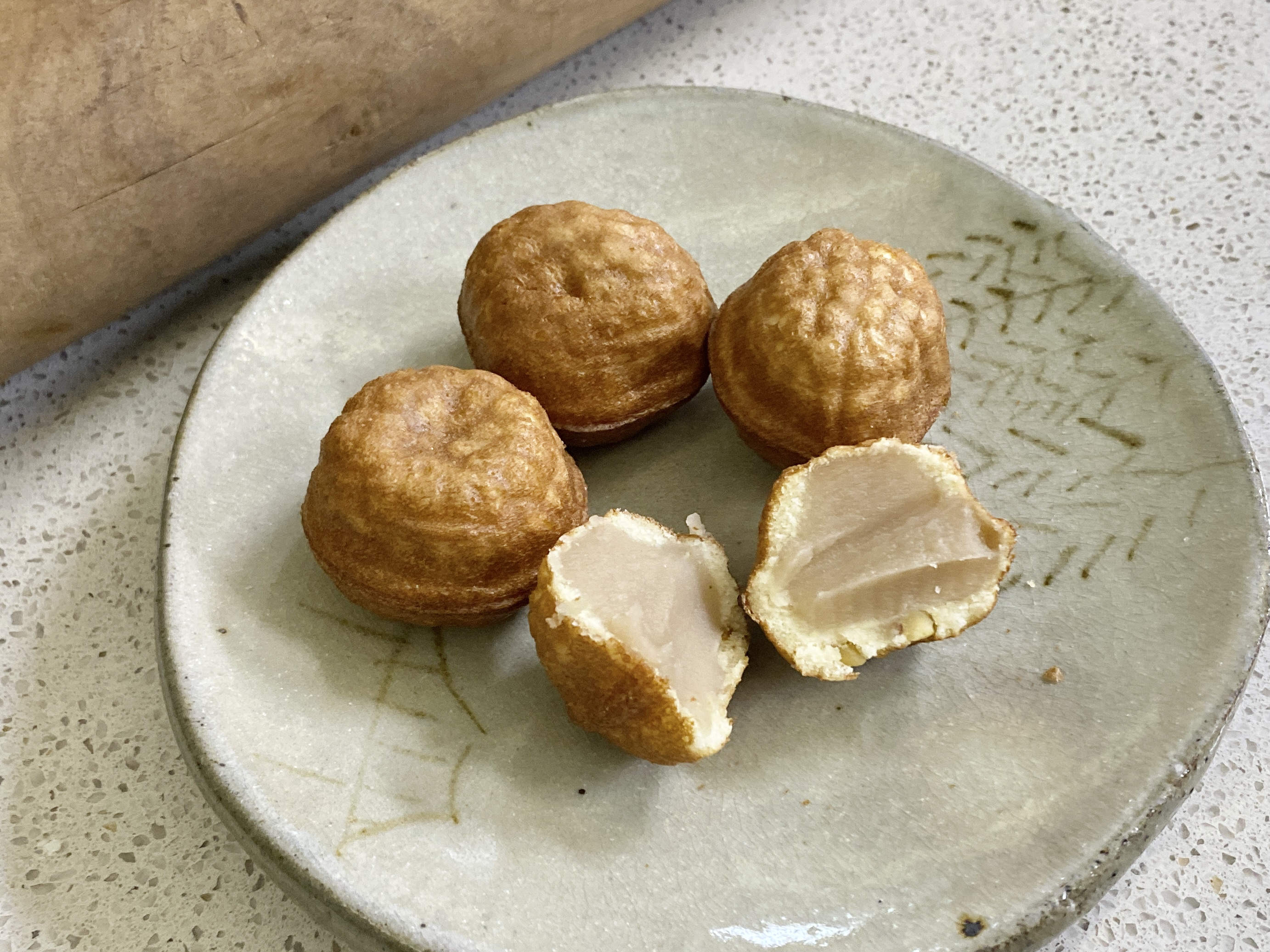 Hodu Gwaja is a Korean dish. Round, walnut-sized, flour-based cakes, stuffed with sweet bean paste plus bits of walnut - the somewhat misnomeric name means "walnut (hodu) cracker/cookie (gwaja)." It is the definitive snack at rest stops, available at all rest stops across the country; curiously, despite its overwhelming popularity on the road, hodu gwaja are virtually impossible to find at regular stores.