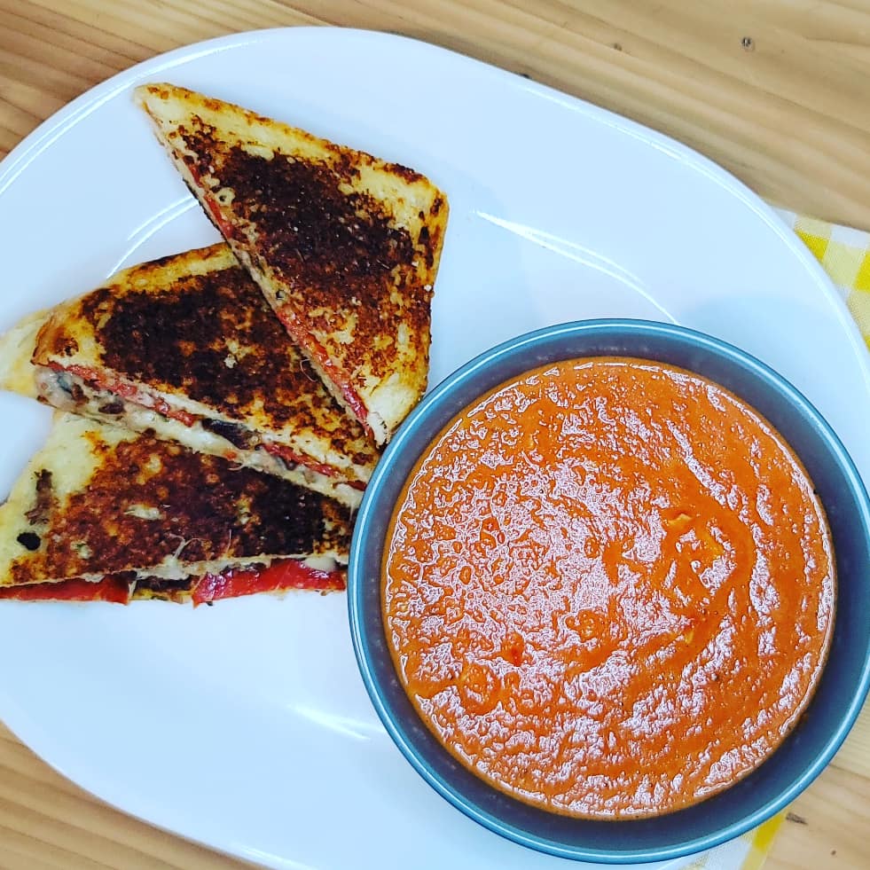 I'm sure you are familiar with the classic pairing of a grilled cheese sandwich and tomato soup. I wanted to take that up a notch and served this soup with Pizza Grilled Cheese Sandwiches. I used cheddar AND mozzarella as well as added in peperoni, Italian sausage, and bacon. It was so tasty together. I got the forever funny comment of "Why didn't you make more?" from the boys on this dinner!