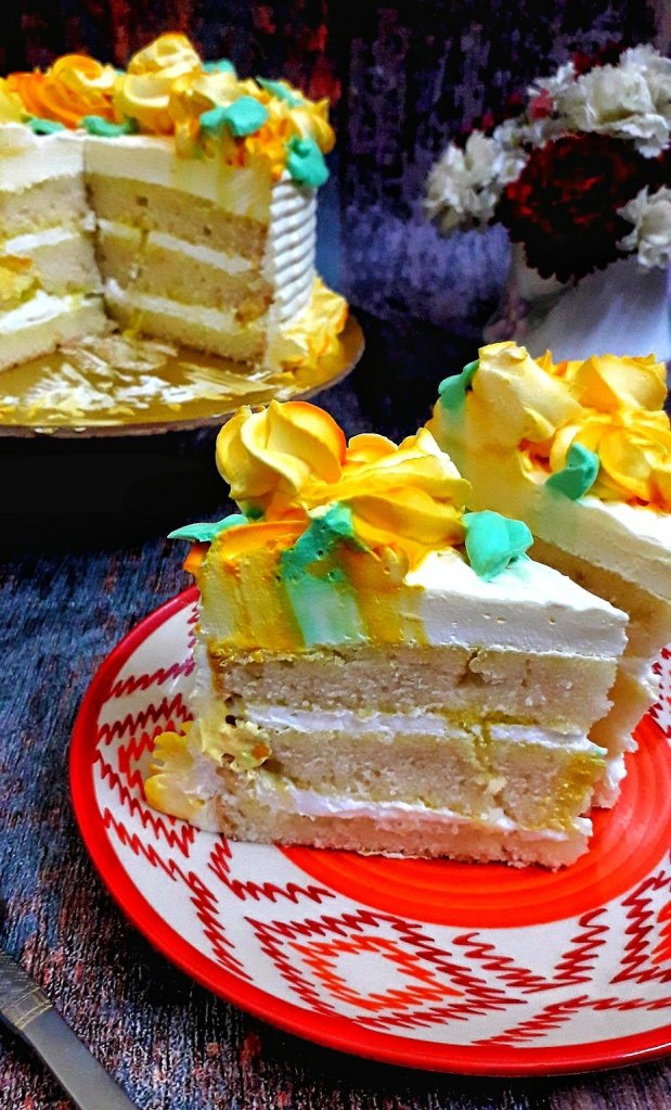 My eggless pineapple cake has 3 layers. I add whipped cream into the moist and soft cake layers, then spread pineapple crush spread in every layer and frost the whole cake with whipped cream. With pineapple flavored sponge and pineapple crush spread in every layers, every slice is bursting with luscious pineapple flavor!