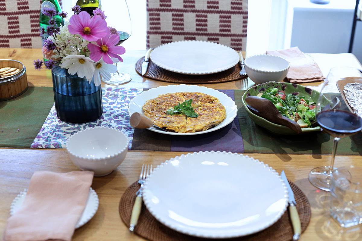 今日の夕食は、たくさん卵があったので早く使ってしまわなくてはということで、以前東京でお友達にご馳走していただいた玉ねぎのフリタータとこれも早く食べなくてはいけないドーナッツ・ピーチを使ったサラダ、そして、チーズ。玉ねぎのフリタータは、軽く食べたい時や卵を消費したいときの定番になりました。前回は炒めた玉ねぎを用意していたのに入れるのを忘れてしまい残念無念だったのですが、今回はちゃんと覚えていました(当たり前 笑)。やっぱり、当然ですが、上に載せるのとは全然違います、フワッと出来上がります。