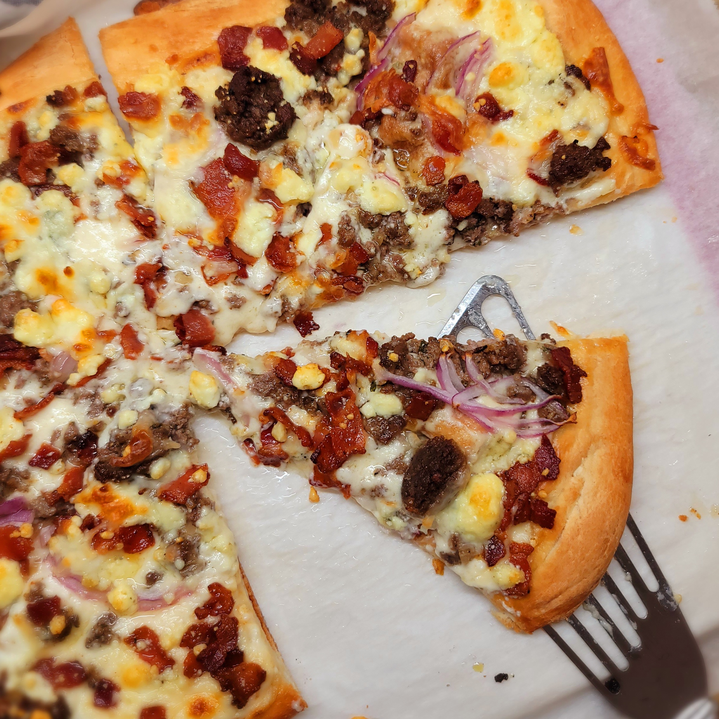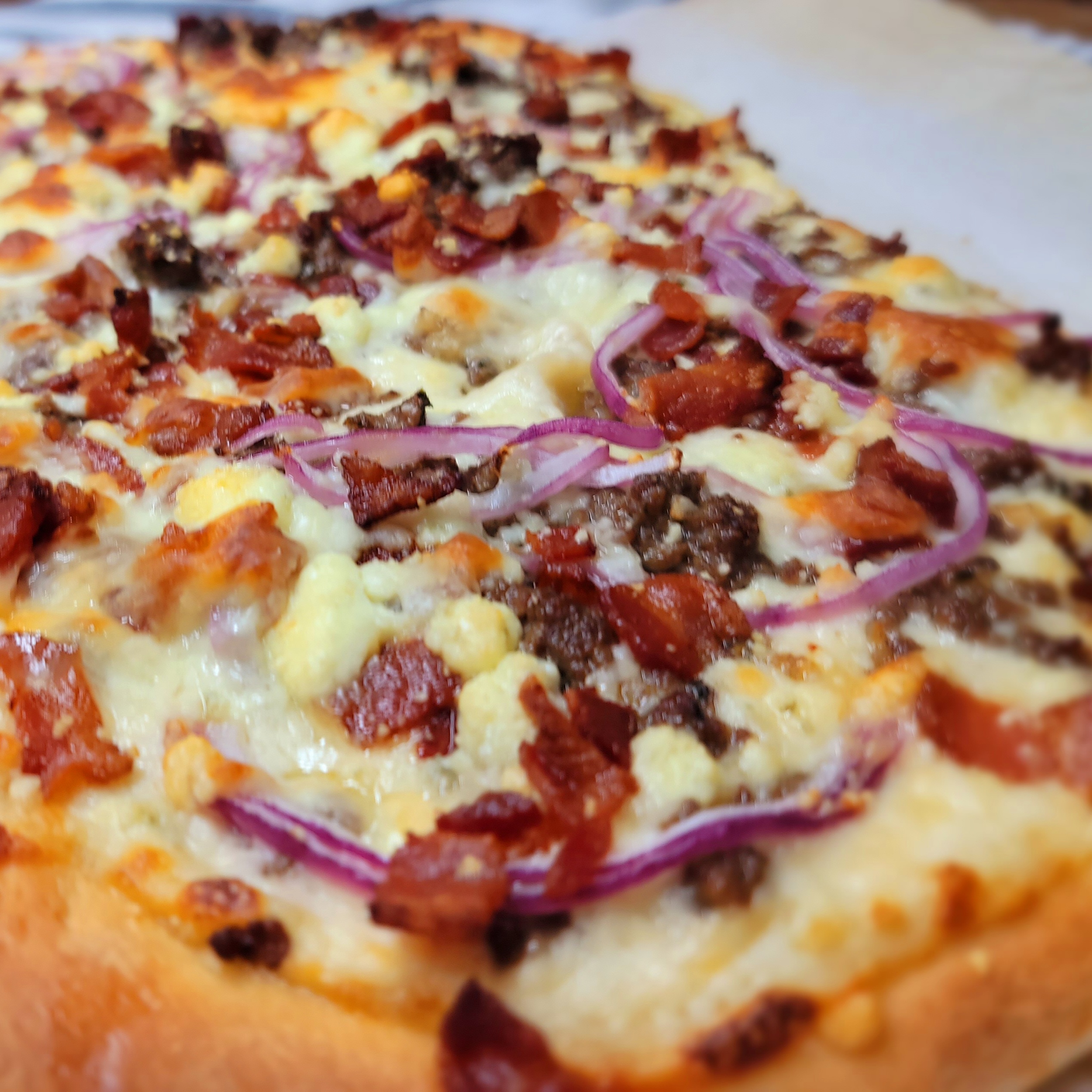 A creamy cheesy sauce topped with ground beef, bacon, blue cheese, red onions and mozzarella!