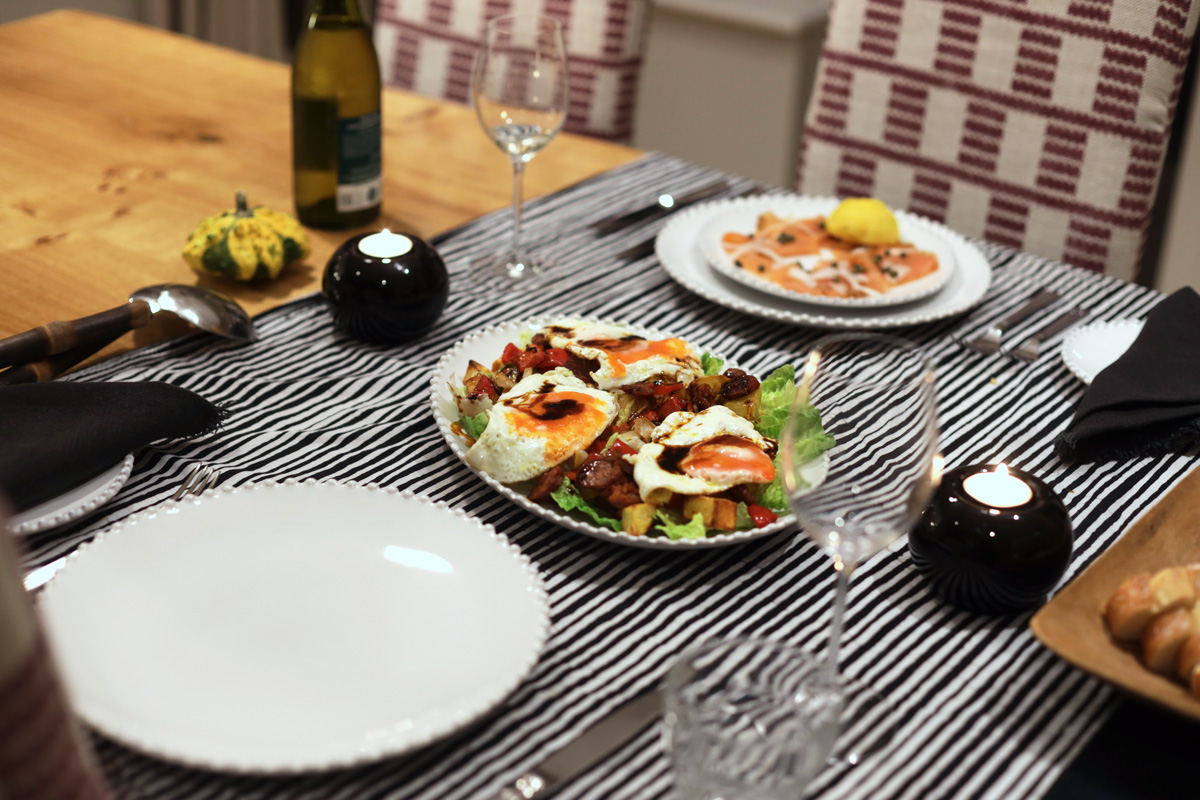 今日の夕食は、チョリソー、ポテト、卵のホットサラダ。元々はポーチドエッグを乗せていたのですが少し前に目玉焼きにしてみたらそれでも良い感じだったので今日は目玉焼きにしたのですが夫に担当してもらったら3つとも黄身が壊れてしまいとろっとしなかっのが残念。とろっとした黄身もドレッシングの一部になるので、固まっていると全体に乾いた印象になってしまいます。やはり、ポーチドエッグの方が無難かも。簡単なレシピなどは、こちらに記載しています。