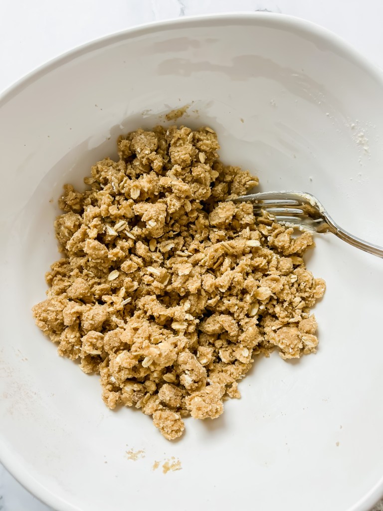 In a medium bowl, mix together all of the crumble ingredients until it's well combined. It should be chunky and rough looking.