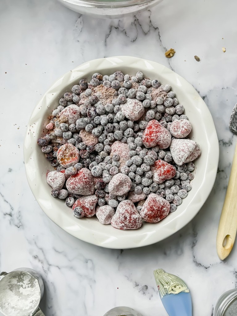 In a large bowl, toss the berries with the brown sugar, cornstarch, salt and cinnamon. Make sure the berries are well coated in the flour.