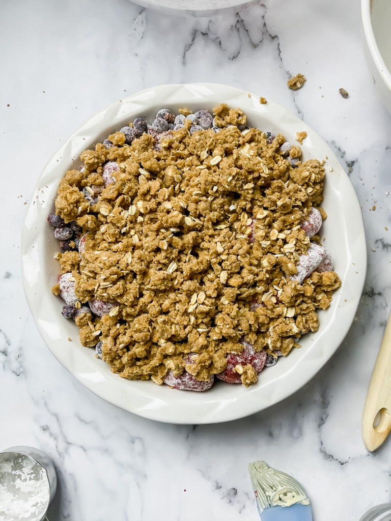 Pour the berries into the baking dish and spread out evenly. Sprinkle the crumble all over the top and then place the baking dish in the oven.