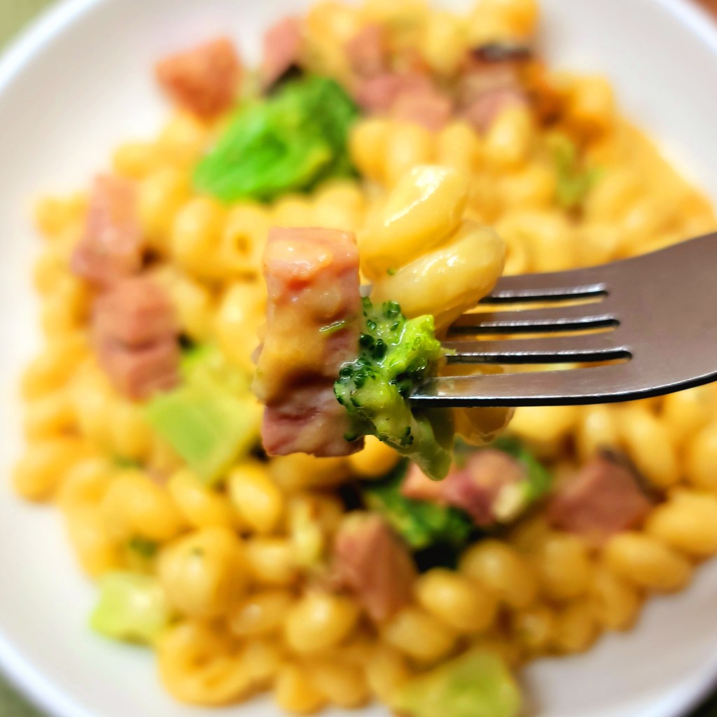Ham, broccoli and cheese is a classic combo that most everyone loves. And it really doesn't get more comfort food than mac & cheese. Ham Broccoli Mac is such a great weeknight meal that the whole family will enjoy. It won't break the bank and nothing is too hard to come by - you probably have most of it in your kitchen at any given time. The one real key to the success of this dish is that you must cook it all in the same pot.  Ham Broccoli Mac The great thing about this one pot dinner is that you don't have to make a separate sauce to be added. By cooking the pasta in the broth, it releases enough starch to thicken the cheese sauce in the end. If you want to use all broth for more flavor or all water, you can change it up as you need. The important thing is to make sure there is enough liquid in the pan to cook the noodles to al dente, so as long as the noodles are completely submerged in the pan, you will be good to go.  Ham Broccoli Mac You will notice that I listed fresh or frozen broccoli cuts for this recipe. You can use either and it will cook to about the same doneness. I do not like my broccoli to be over cooked or mushy. So by adding it fresh or frozen allows it cook just enough to be steamed but still crisp. If you prefer it to be a little more done than that, you can add it to the pan a little sooner. But still wait to add the cheese until the last 5 minutes.  Ham Broccoli Mac This is a super filling dish - you really will not need any side dishes to go with this. You have all the staples - meat, veg and starch - all in one pan. The clean up is super easy too with just a few bowls, forks and the saute pan (you need a big saute pan, a twelve inch one works best).  Ham Broccoli Mac Now Let's Get Cookin'! Ham Broccoli Mac  A simple #onepot dinner with chunks of ham and broccoli in a creamy mac & cheese - 2 tbsp Oil