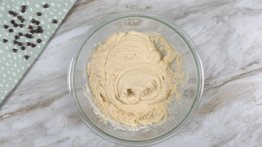 Once the mixture is uniform: add in the flour, baking powder, baking soda, salt and mix.