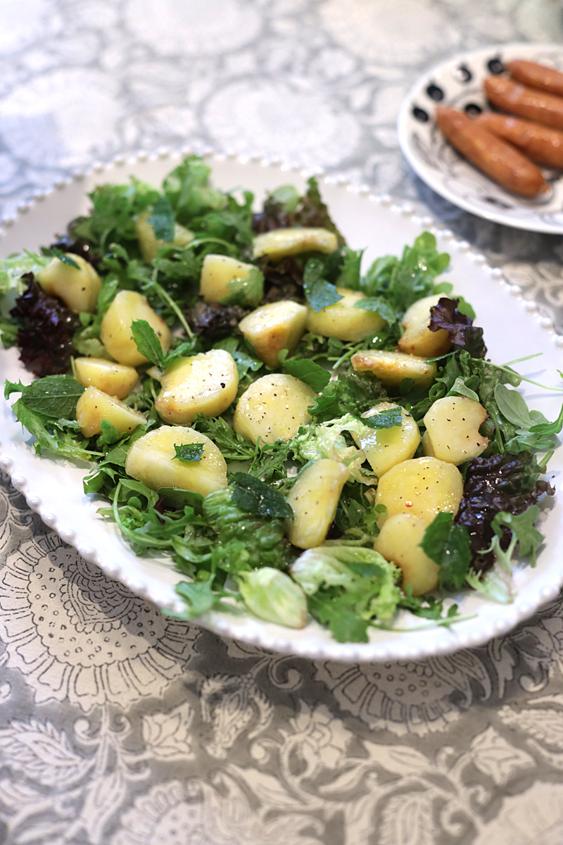 熟れたドーナッツピーチが冷蔵庫にたくさん出番を待っていたので、今日のサラダは桃とミントのサラダにしました。サラミ類やチーズとも合うので。他はいつもと同じ、ポテト、サラミ類とコーニション、日本のソーセージ。チーズの上には微塵切りの玉ねぎやパプリカやガーリックパウダーをかけます。