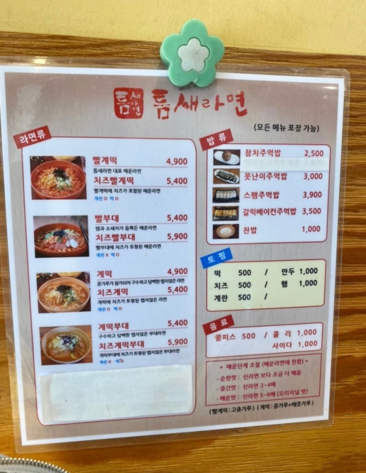 Beyond the oddity of the location, Teumsae Ramyeon was notable for allowing customers to customize their orders - a revolution at the time. 3 variations were available: Ddeok Ramyeon (with rice cakes), Gye-Ddeok Ramyeon (with egg + rice cakes), Bbal-Gye-Ddeok (with extra chili powder + egg + rice cakes). Other gimmicks included specialized jargon: for water, the customer had to ask for "ori bangseok (오리방석) (duck cushion)."