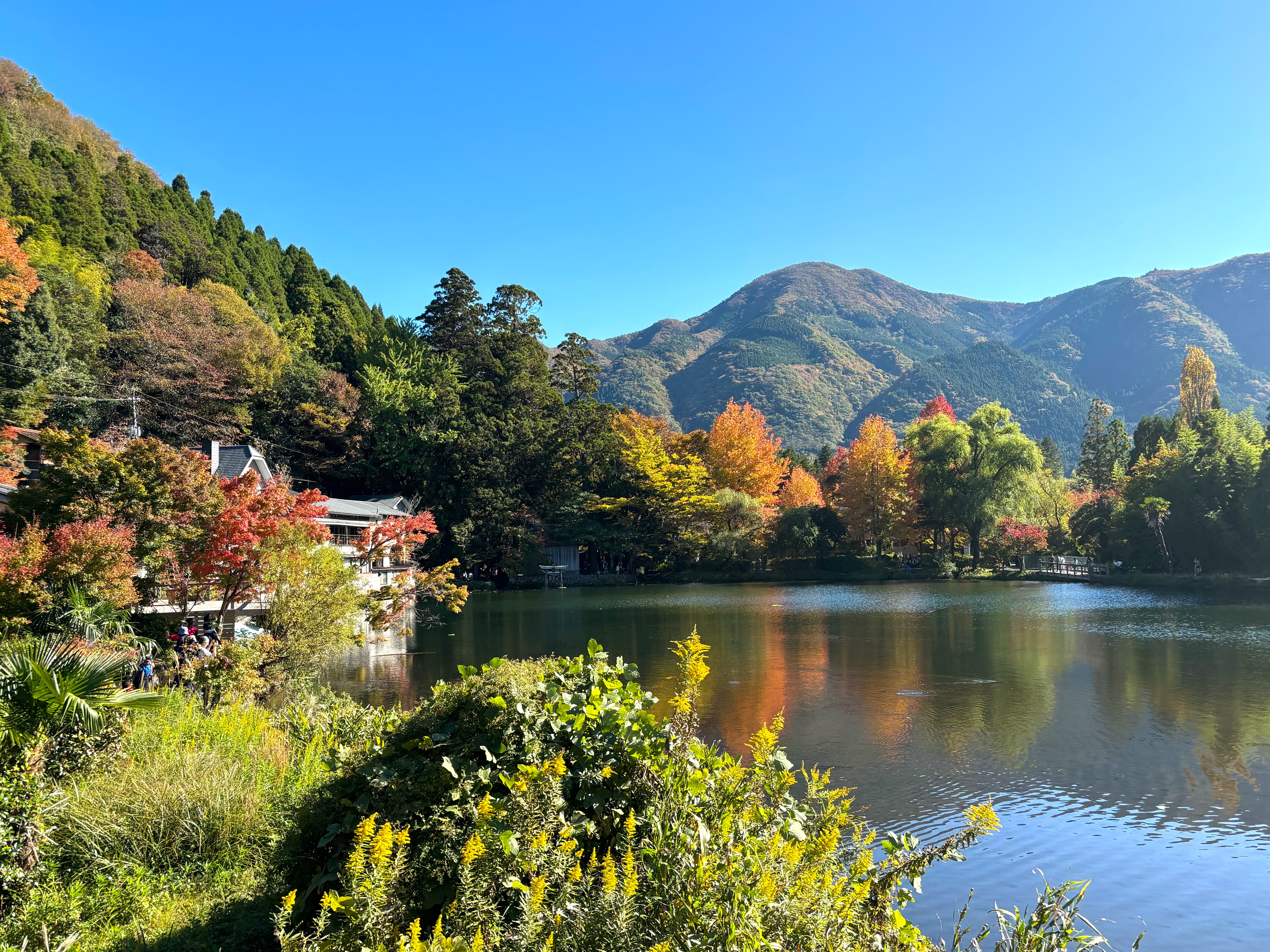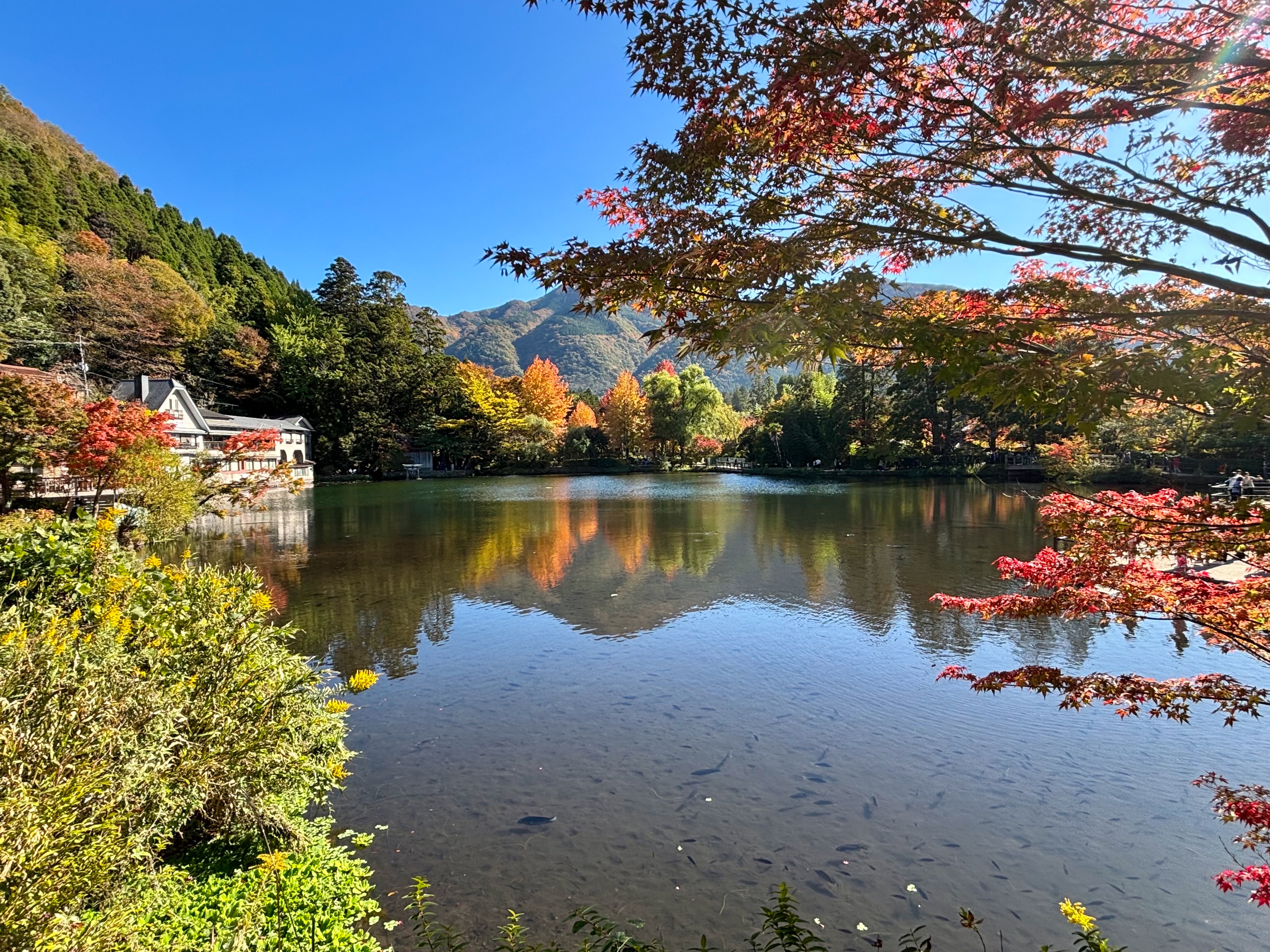 金鱗湖でランチをしてお茶を飲んでゆっくりしてから、金鱗湖の周りはぐるっと歩きました。イギリスを出た時はイギリスの紅葉には早すぎましたし、日本の紅葉は大体11月末というイメージでわたしたちは11月中旬にイギリスに戻るので、今年の紅葉はみられないなと諦めていましたが、金鱗湖の辺りはそこそこ紅葉が進んでいて綺麗でした。きっと、もっと進んでもっと綺麗になるのだと思いますが、少しでも紅葉を楽しめて嬉しかったです。