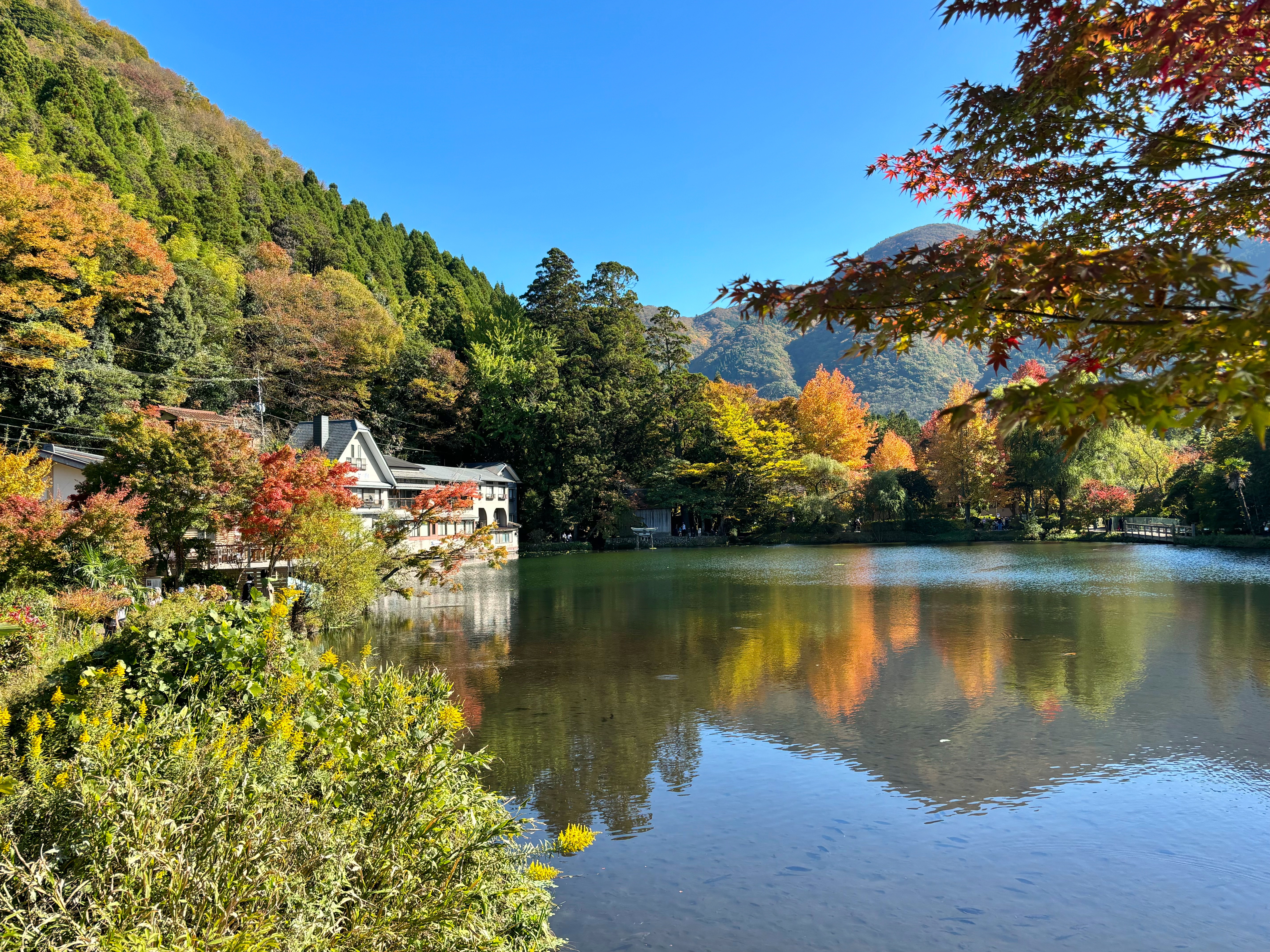 So, after taking our time at the cafe, we walked around Kinrin-lake. When we left England it was too early for autumn leaves and in general where we are autumn leaves are at their best at the end of November or early December, so I'd given up seeing autumn leaves this year. Although I'm sure they'll be more beautiful in a couple of weeks, they already looked very pretty and I'm glad we were able to appreciate autumn leaves this year.