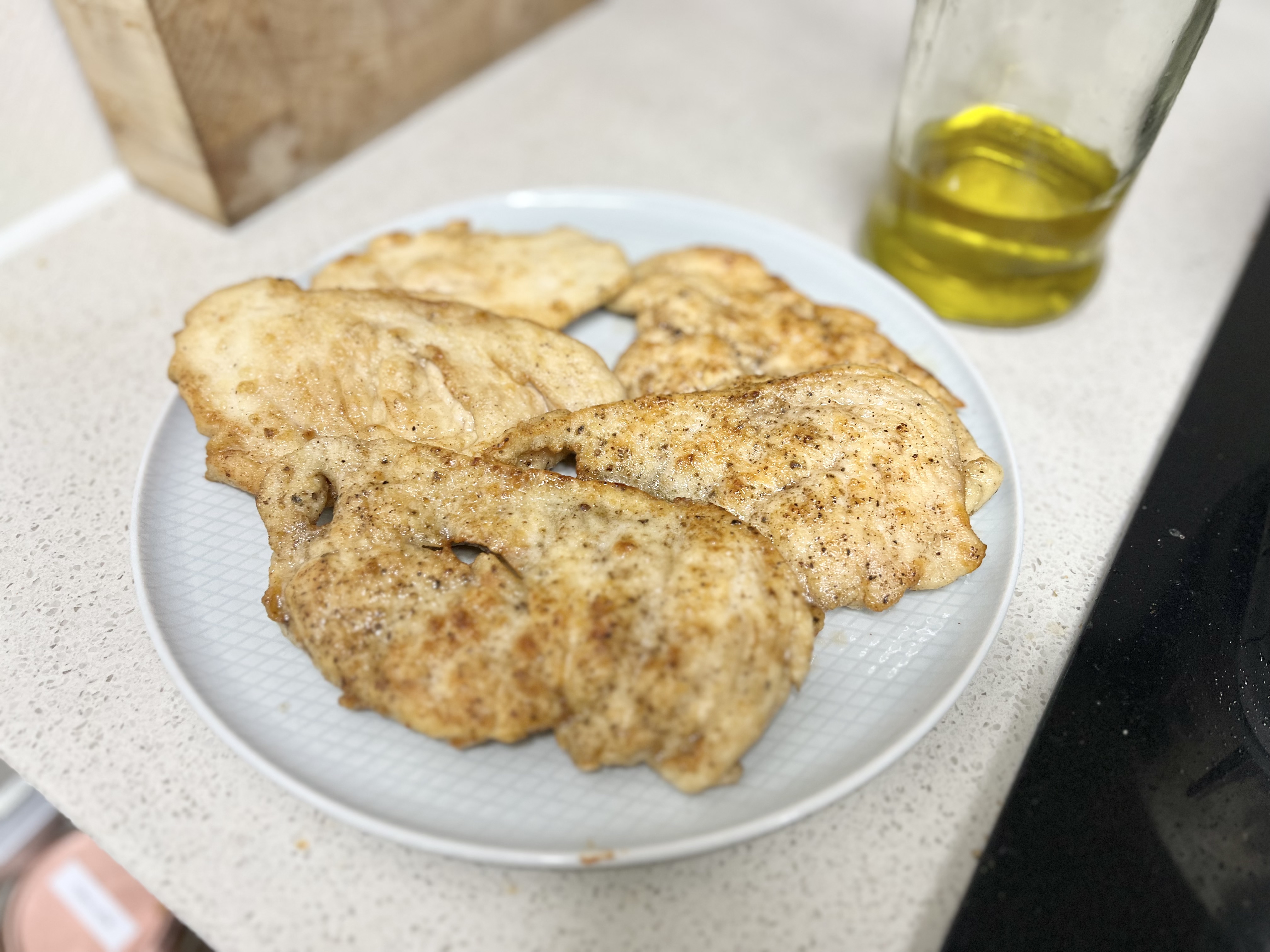 Achieved better color on the chicken by cooking it in a slightly thicker layer of olive oil + butter to the skillet, which facilitated more even browning of the uneven surface.