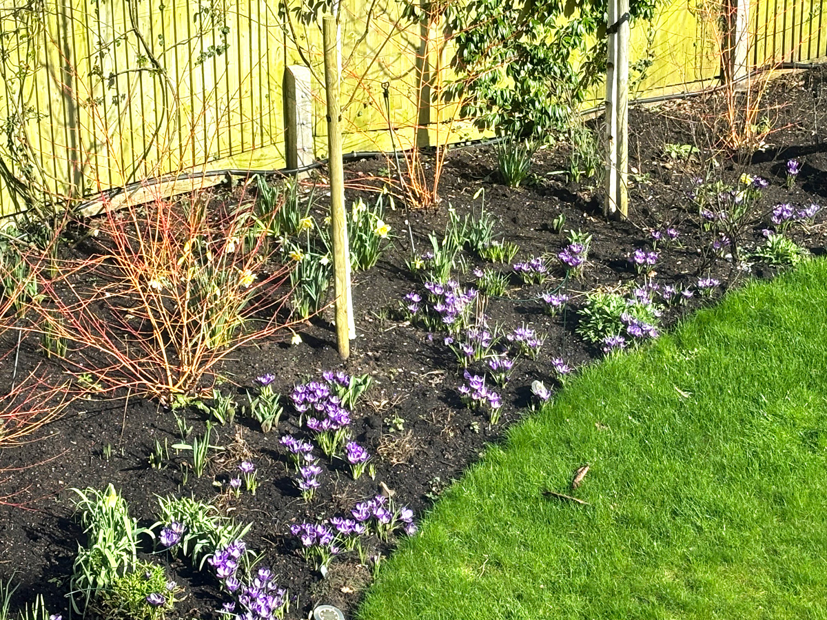 ところで、少し前にたくさんクロッカスが咲いている様子をアップしましたが、あの時点では蕾だったみたいで、昨日戻ってきたら一斉に咲いていてとても綺麗です。
