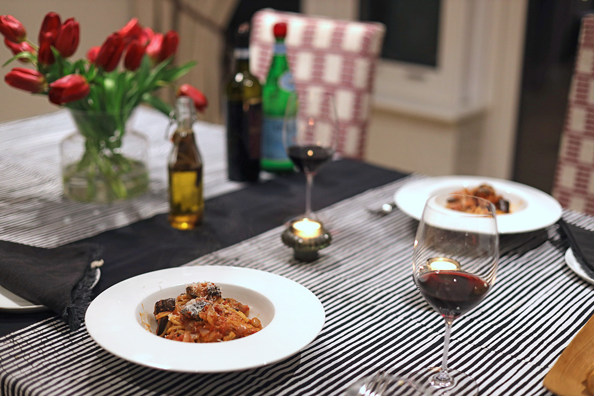 フランス菓子教室もあり、ビーフのビール煮も作ったので、夕食は簡単パスタ。早く食べた方が良さそうな茄子が1本あったので、茄子とスパイシーなトマトソースのパスタにしました。