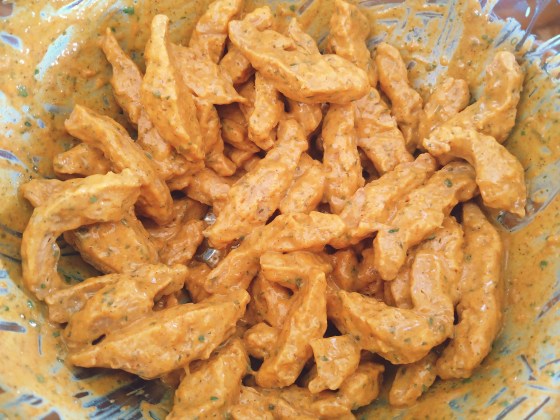 - Squeeze out any excess stock and place the soya strips into a mixing bowl. In a small dish, whisk together the yoghurt, tomato puree, curry powder, lemon juice, turmeric, salt and black pepper. Pour the marinade into the mixing bowl and mix well to evenly coat the strips