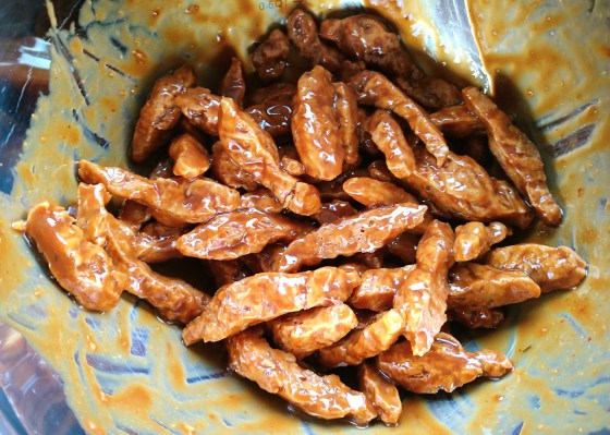 - Squeeze out any excess stock and place the soya strips into a mixing bowl. In a small dish, whisk together the teriyaki sauce, yoghurt, sriracha and soy sauce. Pour the marinade into the mixing bowl and mix well to evenly coat the strips