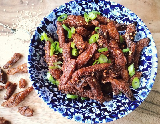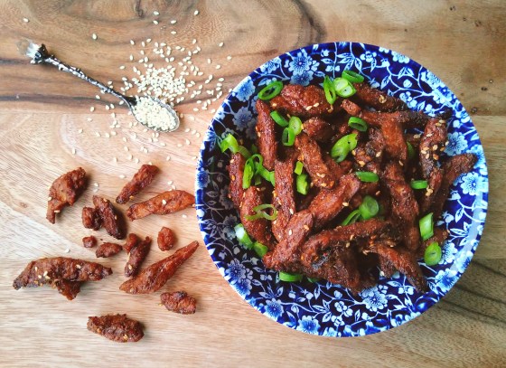 Today I'm sharing three different easy recipes for soya strips. They're lovely hot or cold as a snack, or you can eat them while they're hot in wraps or rice bowls. They're really simple and easy to make, and high in plant based protein too. I buy soya s… | Bethany's Vegan Kitchen March 30 | Today I'm sharing three different easy recipes for soya strips. They're lovely hot or cold as a snack, or you can eat them while they're hot in wraps or rice bowls. They're really simple and easy to make, and high in plant based protein too. I buy soya strips online from Alternative Stores and from House of Natural Food. They may also be available from health food shops Meaty Soya Strips  Yield: Four servings Cook time: 55 minutes, including 30 minutes marinating You'll need: - 75g soya strips