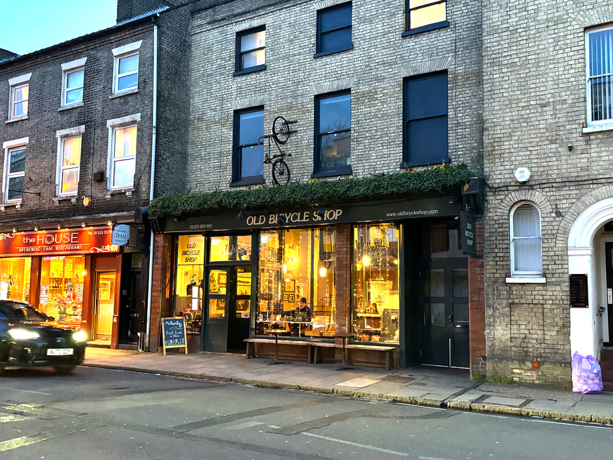 今回、ケンブリッジで泊まった日の夕食は、夫が検索して見つけてくれた Old Bicycle Shop (古い自転車屋)というレストランに行きました。その名の通り、昔大きな自転車屋さんだったところをレストランに使っていて、昔の名残があちらこちらにあって面白く、オシャレというか今風というか、とても良い感じでした。
