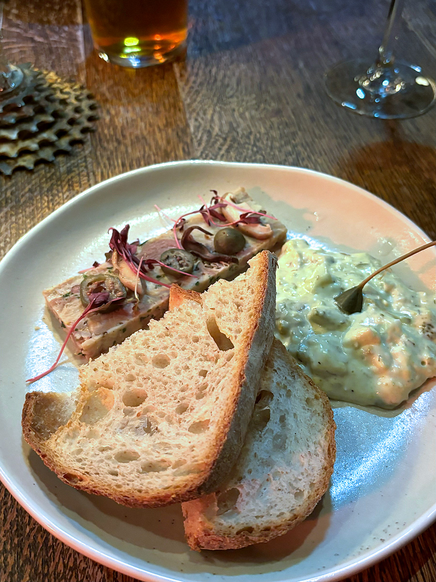 わたしの前菜は、チキンとスモークハムのテリーヌ、椎茸のピクルス、ケイパーベリー、グリビチェソース。グリビチェソースというのは初めて見ましたが、ググってみたところ、ゆで卵をマヨネーズに混ぜたようなソースのようでした。チキンは臭みがありましたが量がとても少なかったですし、ソースの味が濃かったのでいただけました。ですが、何を食べてもソースの味になってしまうので、これが良い組み合わせかと言われると疑問です。でも、ここまではまだ良かったのです。
