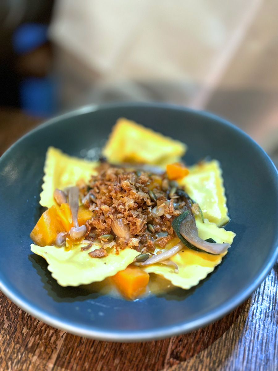 My husband ordered "Pumpkin ravioli, sage butter, roast pumpkin, sateed mushrooms, crispy shallots, pumpkin seeds". Very classic combinations of ingredients. He said it was OK.