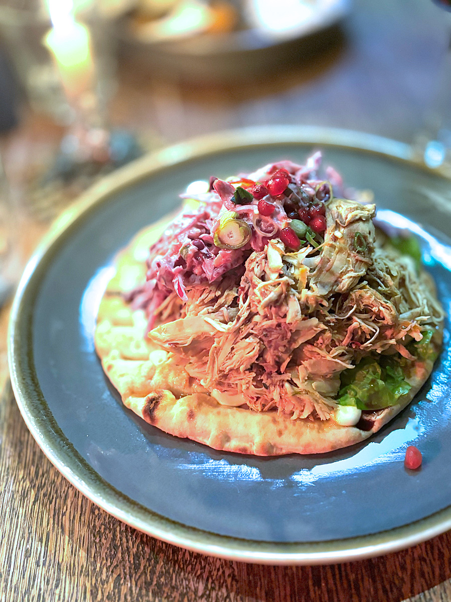 わたしはメインに、Old Bicycle Shop 特製のハリッサでマリネしたチキンのケバブ、アイオリ、クランチーなコールスロー、柘榴、をオーダーしましたが、これは酷かった(涙)。まず、下に置いてあるフラットブレッドは上のソースでベチャベチャ、添える方が断然美味しいと思います。そして、チキンのケバブ、、、これってケバブですか?前の日のローストチキンの残りを割いたみたいなもので、ハリッサの味は感じられなかったですし、臭みもあるし(前日焼いたような味)、パサパサ。そして、コールスローはコールスローとしては普通に美味しいですがマヨネーズの味が濃すぎて他の何を一緒に食べてもマヨネーズ味になってしまいます。チキンが不味すぎたので、わたしはコールスローとパンだけ食べましたが。。。