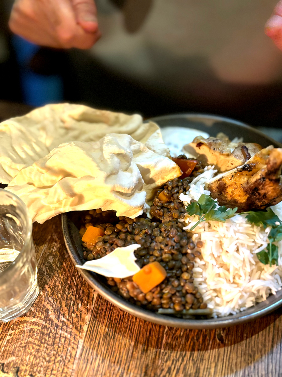 夫は、スクウォッシュ、ココナッツ、レンティルカレー、パパドムとヴィーガンライタ添え、にチキン追加、というオーダーでした。こちらは、かなり薄味でスパイスも少ししか感じられないかなりマイルドな味付けでしたが、多少はカレーらしい味はありましたので、わたしのケバブよりはかなりましでした。が、薄味なのでライスは大量に余りましたし、チキンはほとんど味はなかったです。