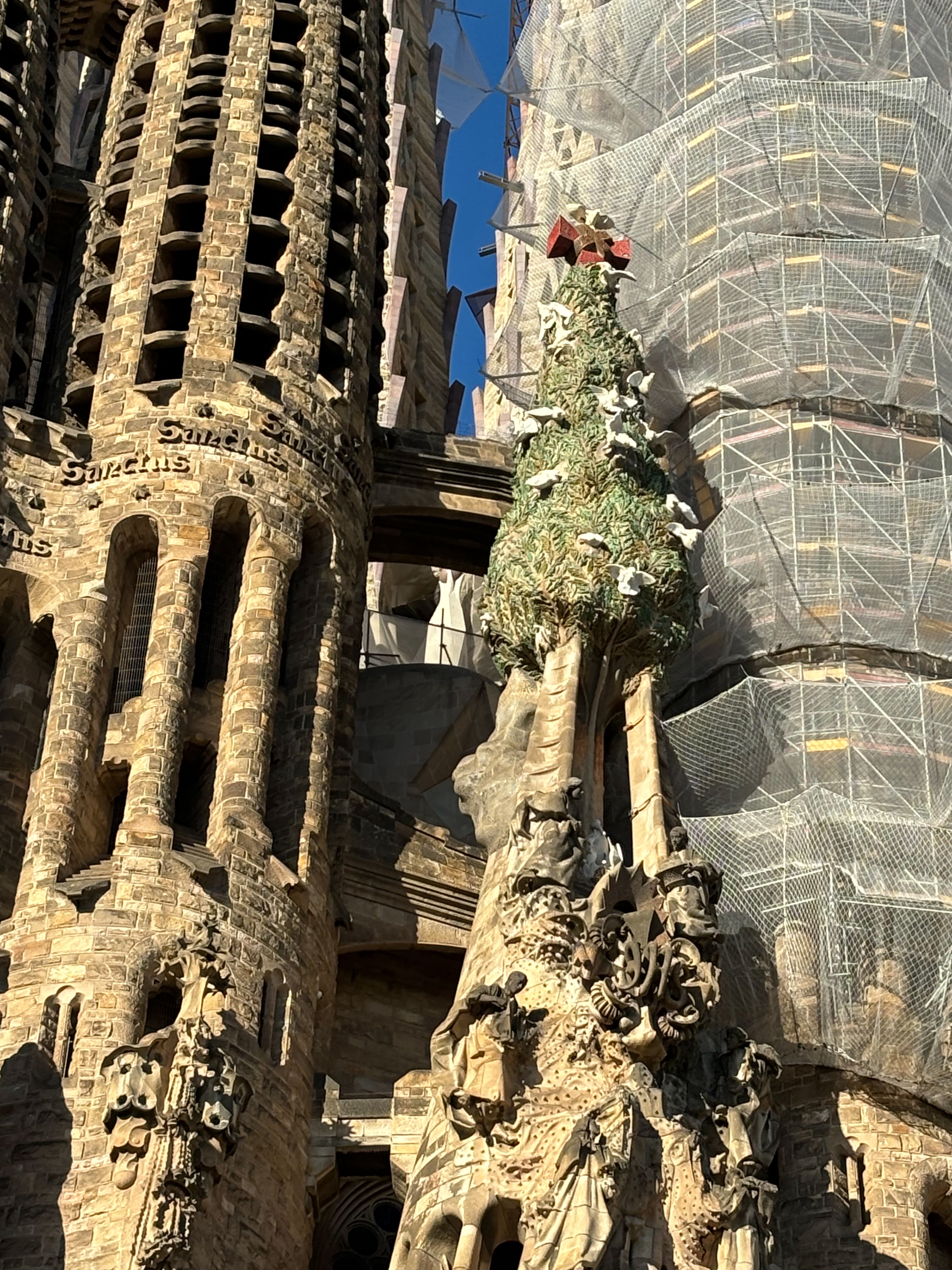市内の主だった建物などをバスで回ってバスの中で案内を聞いた後、サグラダ・ファミリアから歩いて10分ちょっとのところでバスから降りて、案内を聞きながらサグラダ・ファミリアまでゆっくりと歩き、サグラダ・ファミリアでは外部から4つある面それぞれを見ながら案内を聞きました。まだアップはしていませんが、バルセロナに着いた翌日、サグラダ・ファミリアに入り、グループですがサグラダ・ファミリアのガイドさんに中と外を案内してもらったのですが、今回はほとんど外側についての案内で、先日伺った説明以外の説明もたくさんあったので、重複して退屈ということはありませんでした。