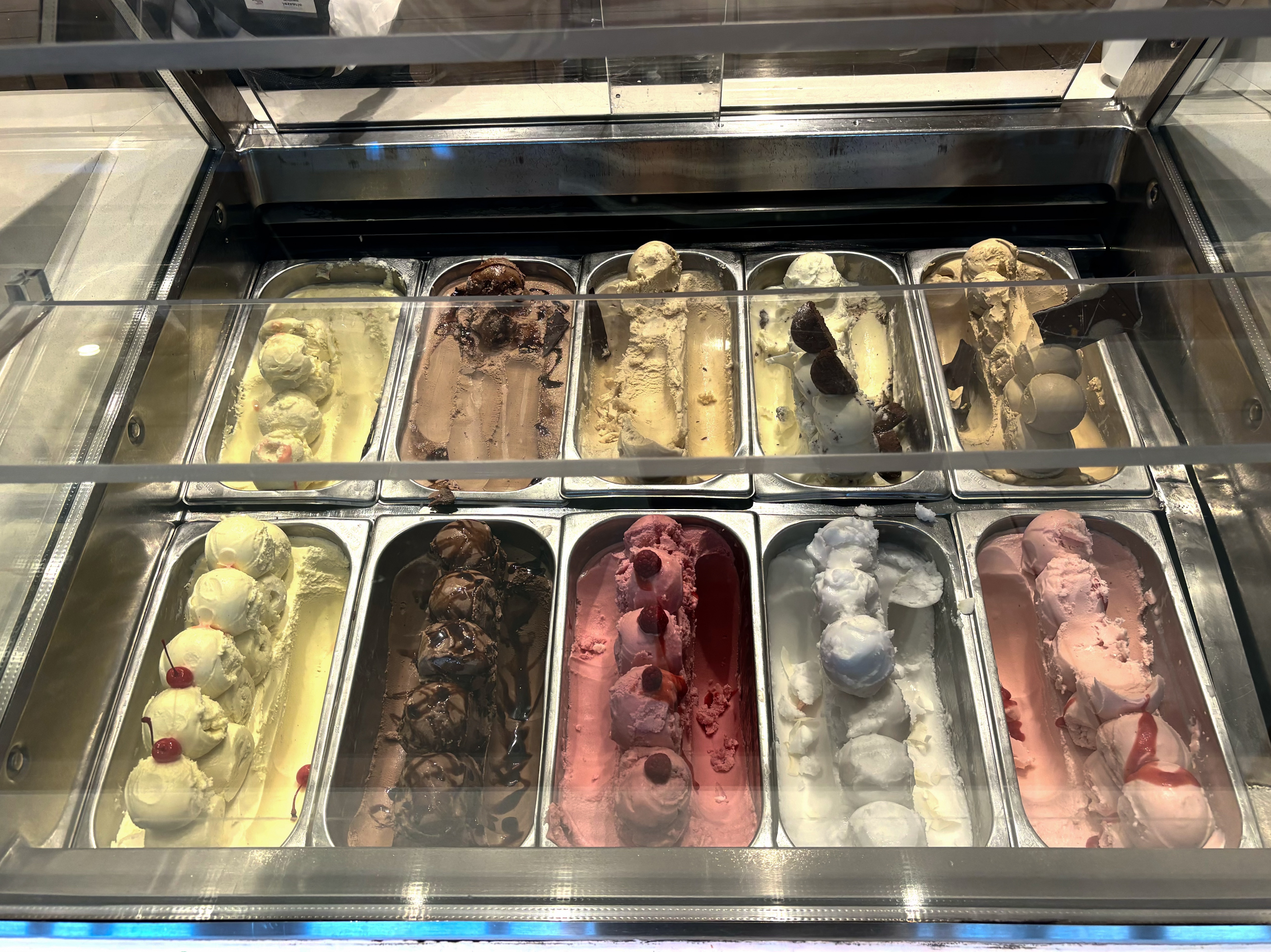エクスカーションの途中の自由時間に朝食代わりに食べたペイストリーがかなり大きかったのでそれほどお腹は空いていなかったので、サラダバーでちょこちょこ取ってパンといただくことにしました。食べ始めると案外お腹が空いてきてもっと食べたいところでしたが、今日はアフタヌーンティーも頂くつもりですし、ディナーもしっかり目なのでこれで終わりにしました。でも、アイスはいただくことに。ココナッツのシャーベット。夫は、バニラアイス。
