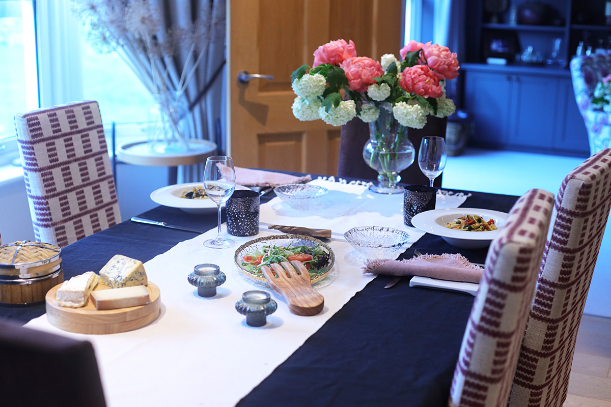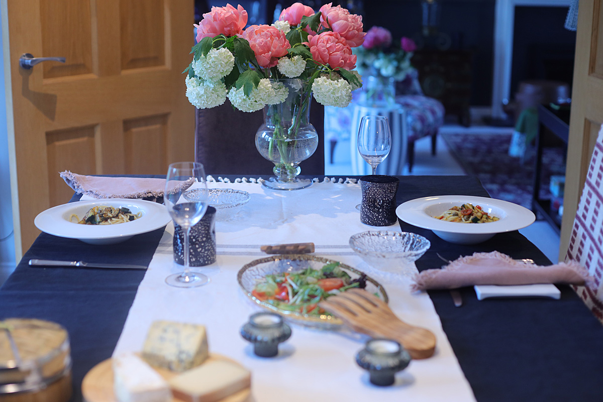 The flowers are peonies from Sainsbury's (£6) and viburnum from our garden. This year, viburnums are full of flowers, some branches have bent and the flowers are nearly on the ground so I cut those and arranged with peonies).