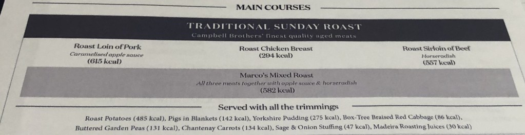 The Traditional Sunday Roast section of the menu offered up a Roast Loin of Pork, a Roast Chicken Breast, and a Roast Sirloin of Beef. I did not deviate from my usual favourite opting for the Roast Beef. I did momentarily consider the "Marco's Mixed Roast" which was selection of all three but not today I was in the mood for some pink beef, hopefully lots of it too.