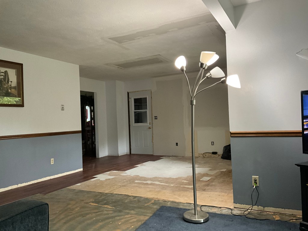 Our kitchen is gutted, the electric is in, the drywall is finished (except for the ceiling) and some of the kitchen and the living room has the start of the new floor. We have a pretty big dining room that was remodeled last year so we are continuing with the same flooring that we put in the dining room.