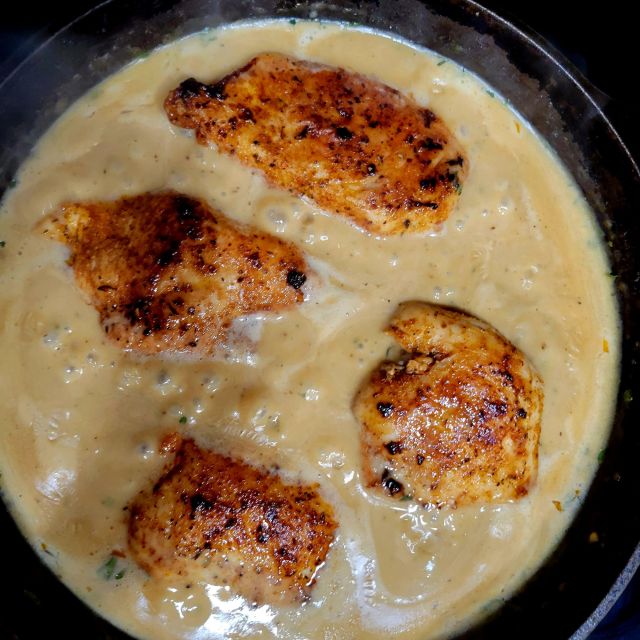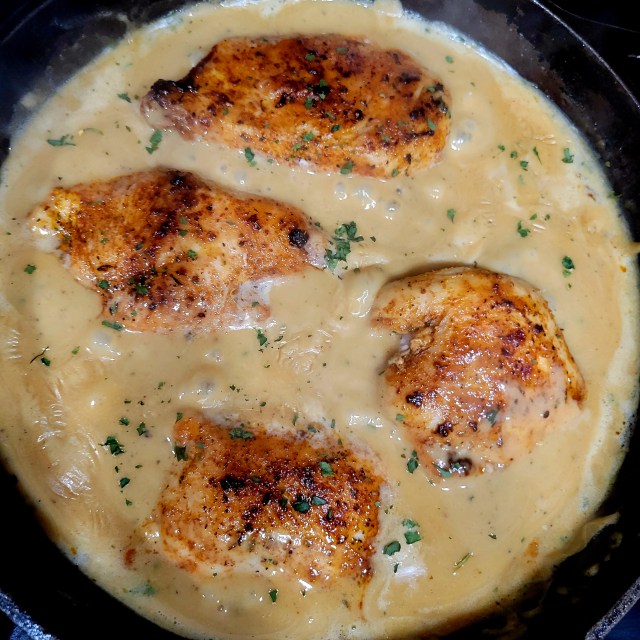 • Finally, return the cooked chicken breasts to the skillet and spoon the creamy sauce over top. Allow the chicken to heat through. Serve with fresh chopped parsley (optional), and enjoy!