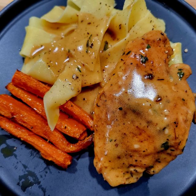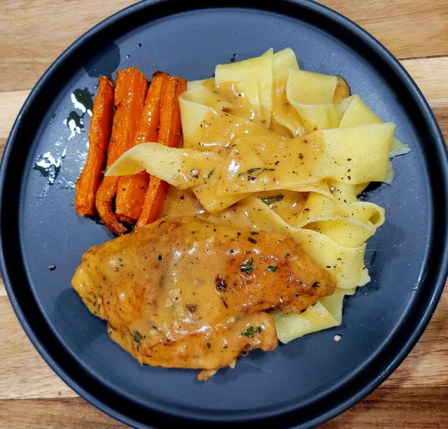 Sharing recipe below (bc I don't measure, etc., ๐คญ) from Budget Bytes, although I did a little differently - instead of putting flour on chicken before cooking, after cooking chicken (seasoned with S, P, garlic powder, Italian seasoning, & paprika) with olive oil and butter, I transfer to plate, turn burner down, add more butter and whisk flour into butter (I used less than this recipe), add broth, stirring until desired thickness. Stir in heavy cream or half & half. Taste and add more salt and/or pepper if needed. Sprinkle with parsley. ๐ I served ours with buttered pappardella pasta ๐ and roasted carrots ๐ฅ Delicious!๐๐