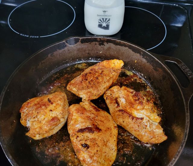 • Next pour the chicken broth and heavy cream into the skillet, then add the garlic powder. Stir and scrape up any brown bits from the bottom of the skillet. Allow the sauce to simmer in the skillet for 8-10 minutes, or until it has reduced and thickened by about 50%. Taste the sauce at this point and add salt and pepper if needed (I added about ⅛ tsp of salt and ⅛ tsp of black pepper).