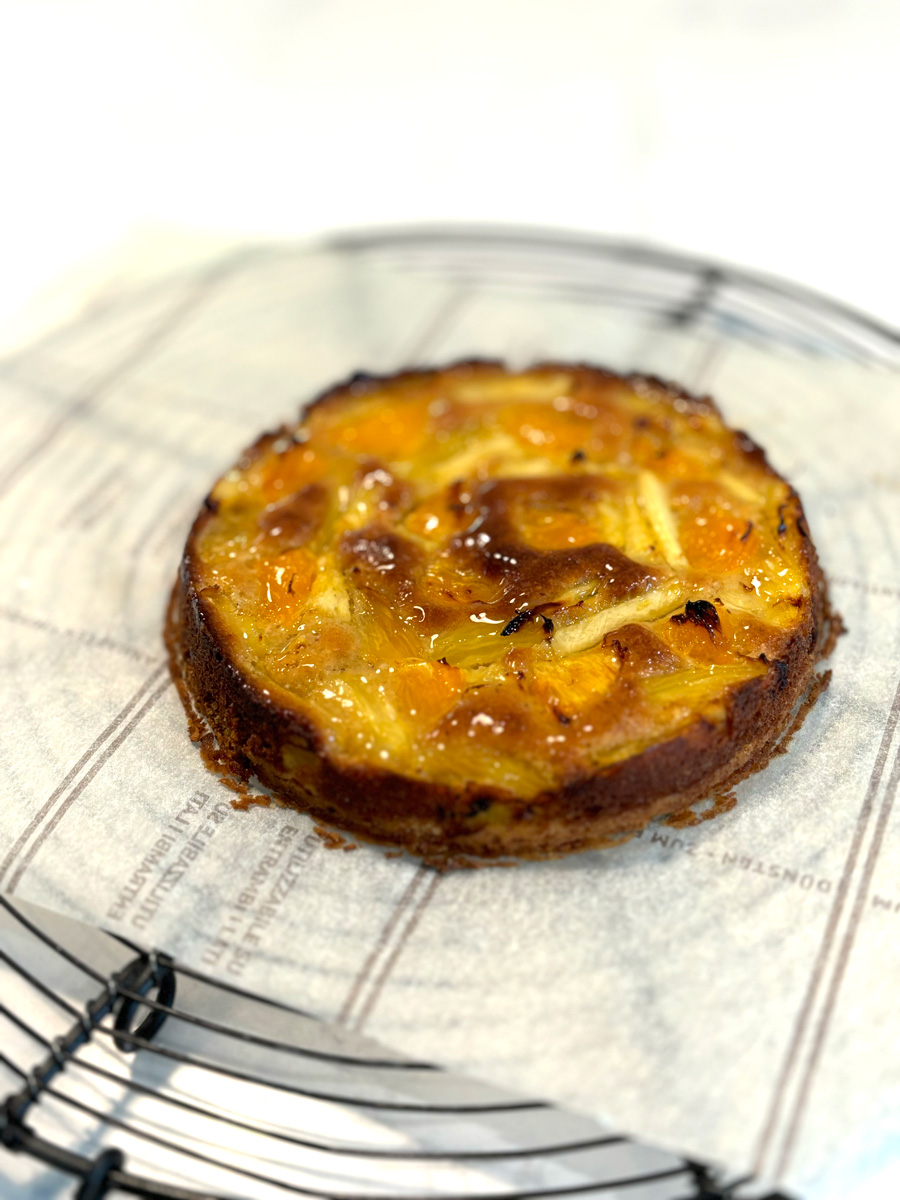 Tarte a l'ananas has orange as well as pineapple and the filling has pistachio powder and pistachio pasteas well as almond powder. We are going to have the other dessert tonight so this has to wait until tomorrow.