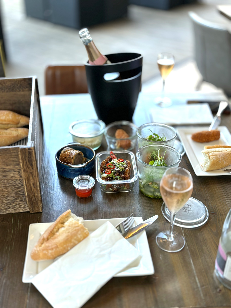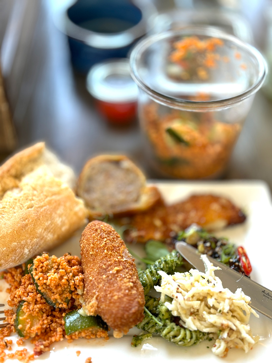 左手前からソーセージロール、地理ドレッシング、チキン照り焼き、パスタサラダ(ペストソース)、その上がクスクスサラダ、左にいってポテトとチーズのコロッケ、最後がセロリアックのサラダ。チキン照り焼きはチキンカツにとんかつソースっぽいソースがかかったものでした。セロリアックサラダは酸味が強すぎましたが、パンに挟めば食べられました。パスタサラダは美味しくなかった。ここのフランスパンは美味しいので、3本買って2本は持ち帰りました。ワインは、ロゼのスパークリング。