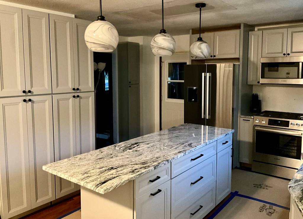 What a productive week this has been now that the replacement cabinets are all here! All of the gray cabinets are the same color but the shadows make them look a different color of gray, especially the little panty by the door. I left the lights off so you could see the hand blown glass design. With the lights on my iPad only showed them white.