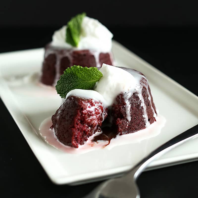 Rich, fudgy, chocolaty vegan cakes with a molten lava center and secret superfood ingredient (hint: there's no food dye)! A luscious dessert for two that's perfect for Valentine's Day & beyond!